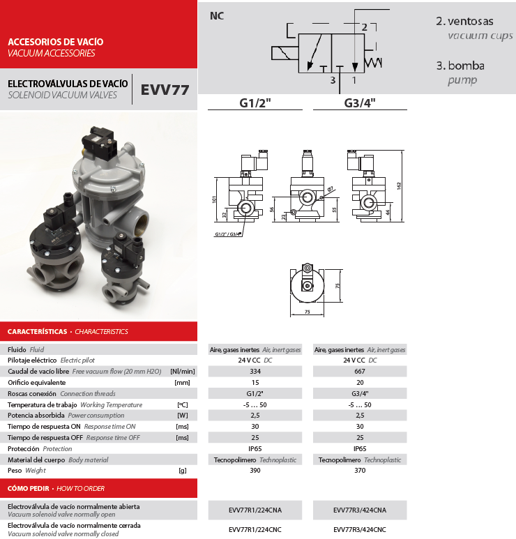 AREVV77R3424CNC ELETTROVALVOLA PER VUOTO, PILOTAGGIO INTERNO CON VUOTO, 3 VIE NC G.3/4″ CON BOBINA 24VDC